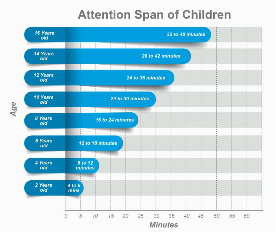 Here is an interesting graph to consider about the attention span of children at varying ages as listed by Brain Balance Centers.